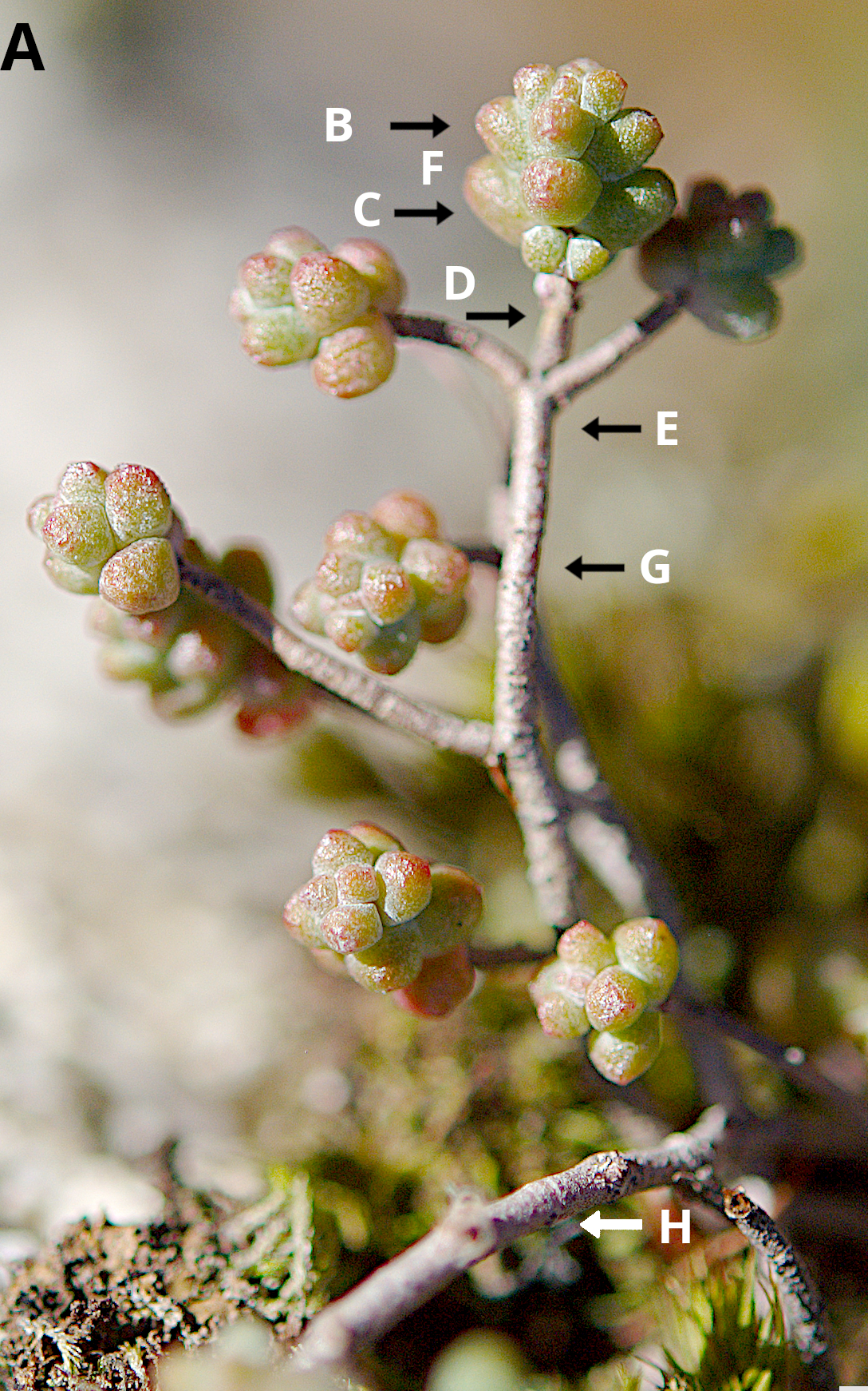 Es una especie de la familia Crassulaceae. El nombre “brevifolium” significa hoja pequeña. Es una planta perenne, sin tricomas (glabras), de color verdoso, rojizo o pardo (Figura 1).