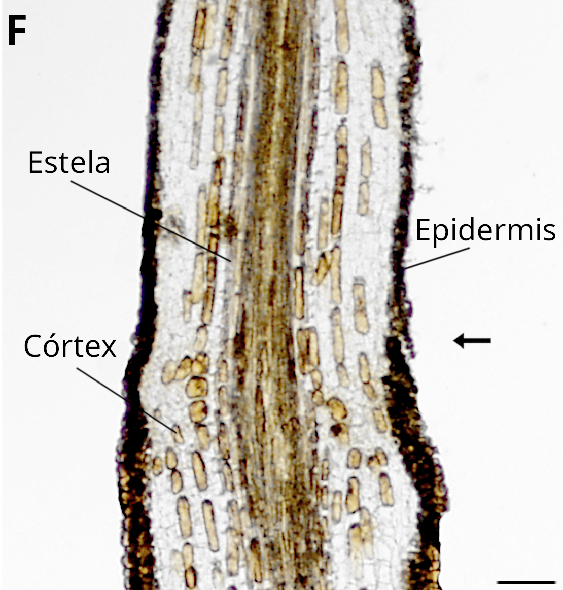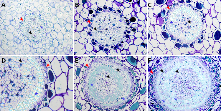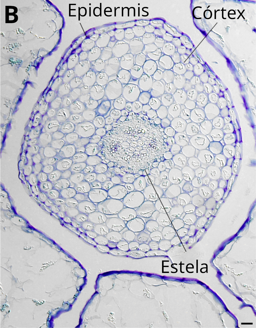 En secciones transversales, el tallo aparece típicamente redondeado y dividido en cuatro regiones: epidermis, parénquima cortical, estela (tejidos vasculares) y parénquima medular (Figura 4).