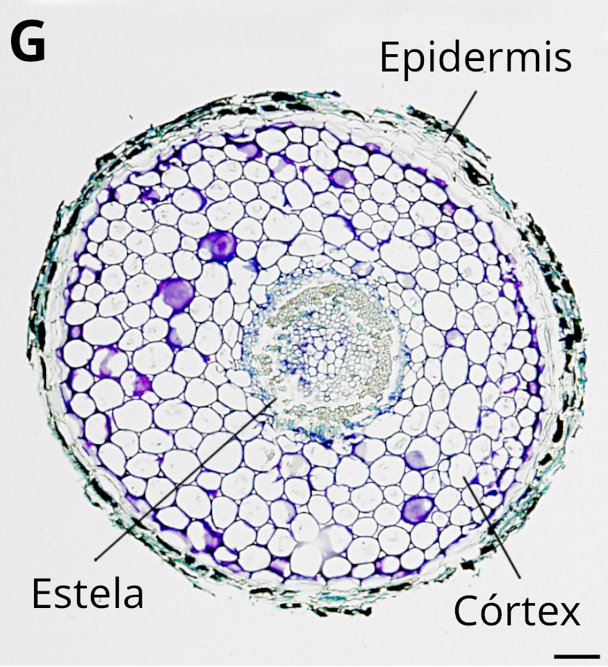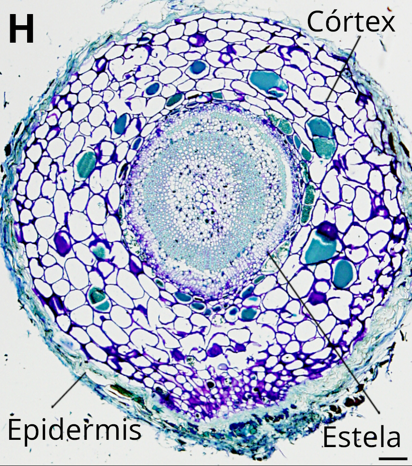 Las células parenquimáticas son redondeadas en vista transversal y alargadas en vista longitudinal (Figura 7). Las paredes celulares se vuelven gruesas a medida que nos alejamos del ápice. Hay entre 6 a 8 células entre la epidermis y los haces vasculares, las cuales muestran muchos espacios intercelulares. El tamaño de las células parenquimáticas es relativamente homogéneo, pero las más internas suelen ser un poco más pequeñas. Hay células pigmentadas dispersas, pero se organizan formando una capa más densa en torno a los haces vasculares. La textura de la pigmentación varía desde homogénea a lo largo del citoplasma a granulado o en pequeños depósitos citoplasmáticos, Muchas células parenquimáticas presentan cloroplastos que se disponen cerca de la pared celular, lo que indica la presencia de una gran vacuola.