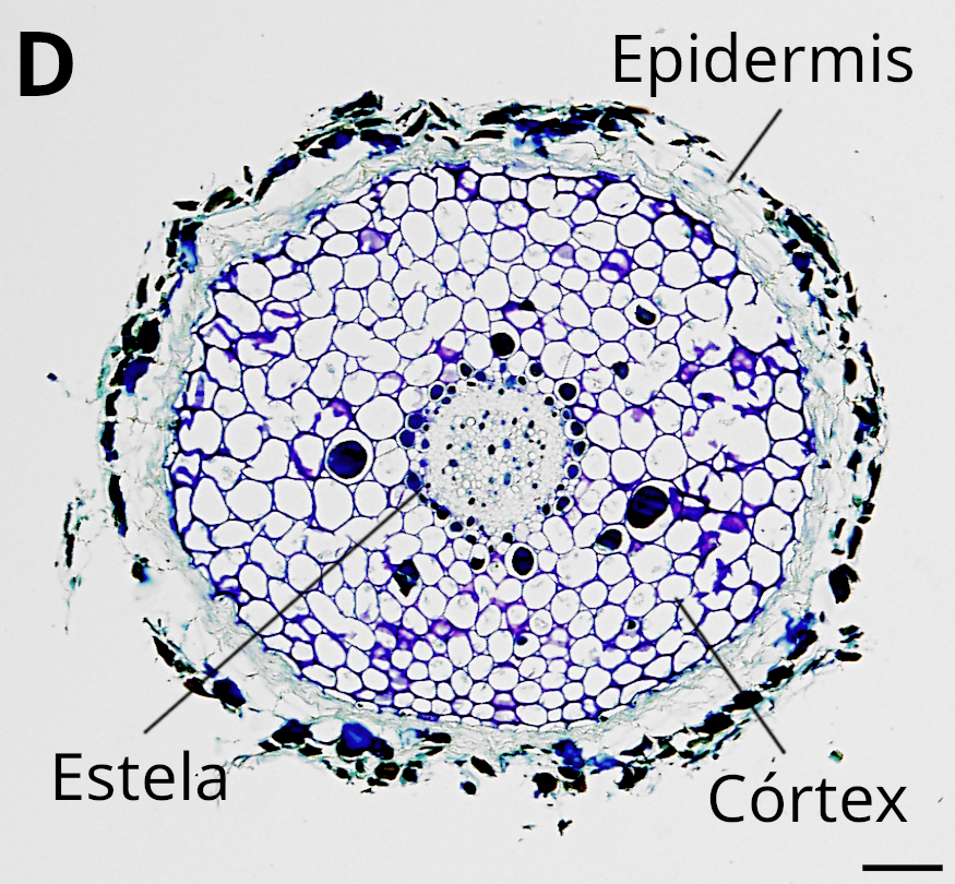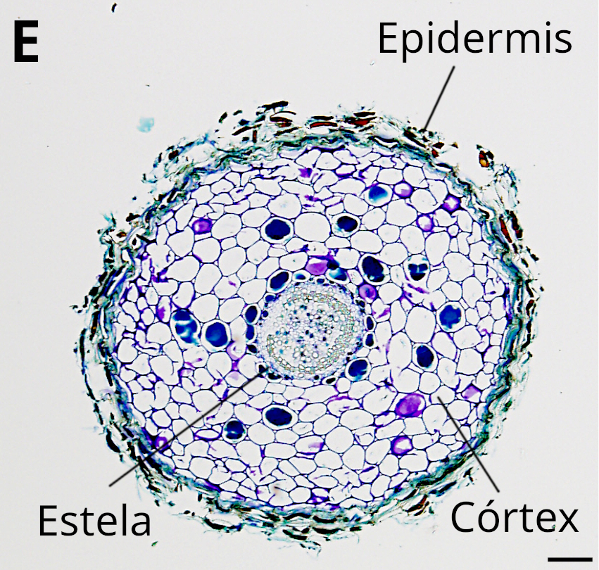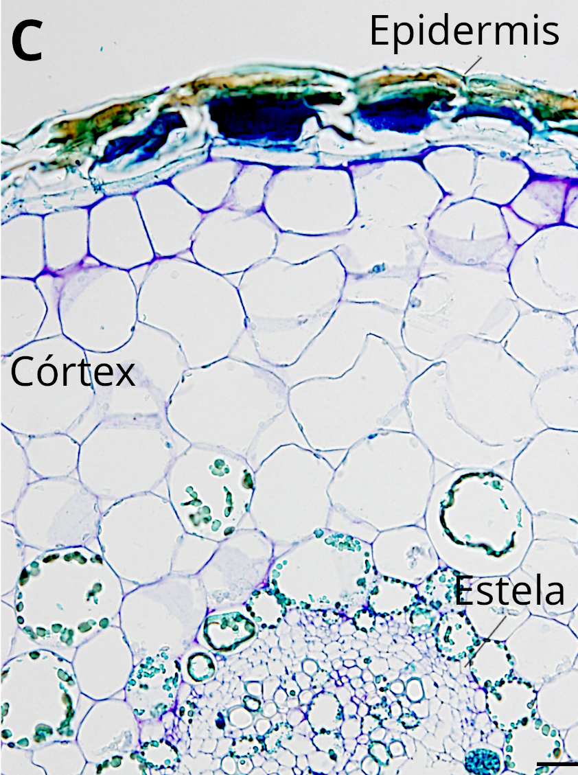 En secciones transversales, el tallo aparece típicamente redondeado y dividido en cuatro regiones: epidermis, parénquima cortical, estela (tejidos vasculares) y parénquima medular (Figura 4).