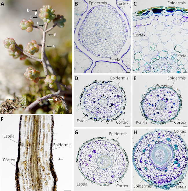 La epidermis cambia conforme nos movemos desde el extremo apical hasta niveles más basales del tallo. Inicialmente es una capa simple de células más o menos aplanadas y con una cutícula delgada (Figura 5). A unos pocos milímetros desde el ápice, y cubierta por hojas muy densamente empaquetadas, se convierte de bilaminar y luego en multilaminar a medida que nos alejamos del ápice. En los niveles medio y basales del tallo se alcanzan las 12 o más capas de células epidérmicas. En los niveles más apicales las células epidérmicas no contienen muchos pigmentos en sus citoplasma, por lo que el tallo aparece blanquecino (ver Figura 3E), pero a medida que se va volviendo estratificado las células epidérmicas contienen pigmentos, aunque no necesariamente todas las capas epidérmicas presentan células pigmentadas (Figura 5F).