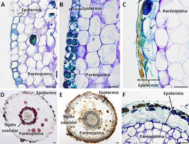 La aparición de capas nuevas en al epidermis parece deberse a una división periclinal de la capa basal de células epidérmicas en contacto con las células del parénquima (flecha en Figura 5C). Esta actividad parece mantenerse incluso en los tallos más alejados del ápice. Las células epidérmicas que componen esta capa basal tienen sus paredes celulares basales y laterales ligeramente engrosadas, tanto como las de las células parenquimáticas subyacentes. Sin embargo, la pared apical es mucho más delgada. Estas última característica se mantiene en el resto de células epidérmicas de capas superiores (Figura 5C; Figura 6).