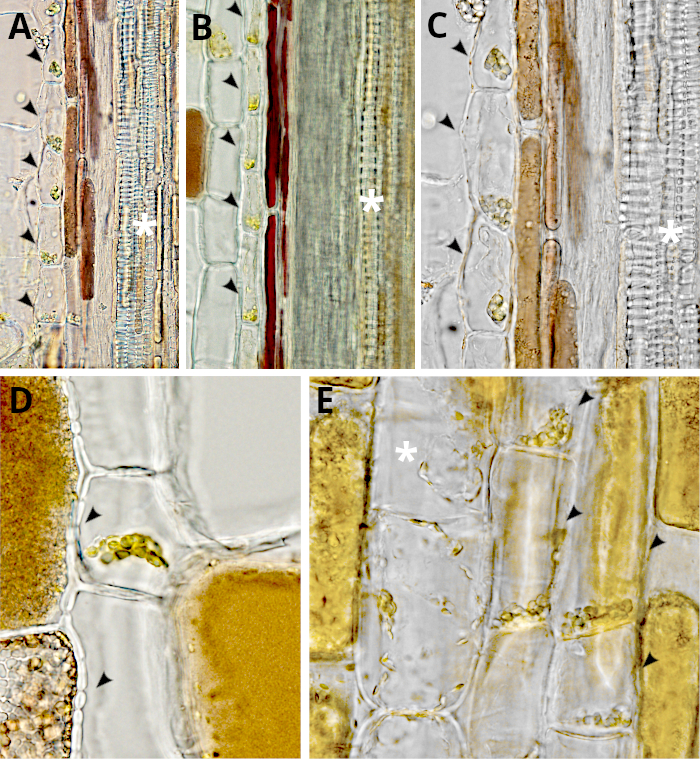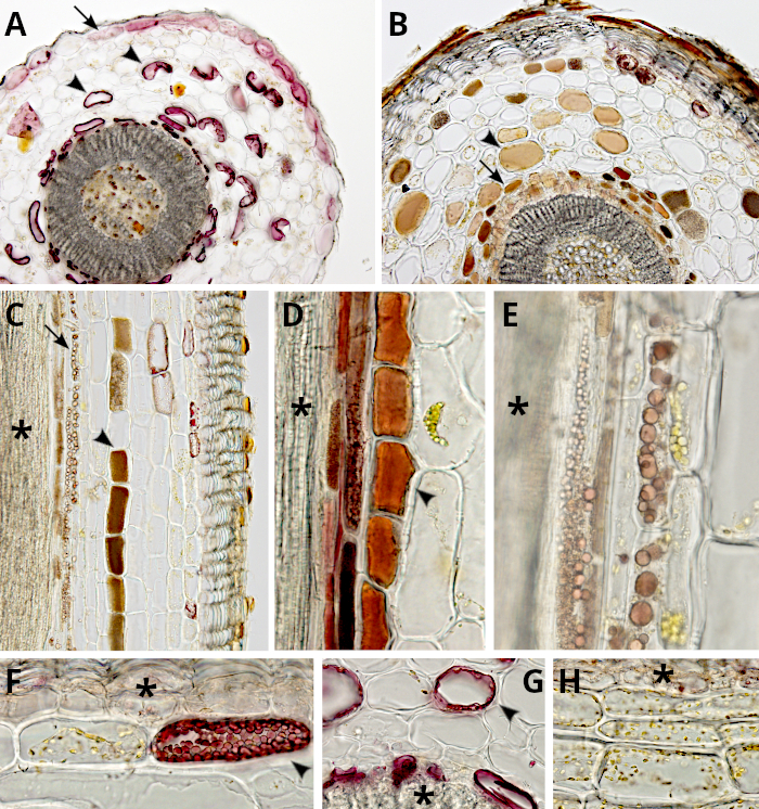 En la zona próxima a los haces vasculares, por fuera de la capa de células pigmentadas, se dispone una capa de células parenquimáticas pequeñas que muestran orgánulos, probablemente cloroplastos, concentrados en la parte basal de las células (Figura 8). Esta podría ser un tipo de endodermis. Estas células son largas y delgadas, o cortas y gruesas. De cualquier manera, son claramente diferentes de las células parenquimáticas adyacentes. En estas células y en otras células parenquimáticas se pueden ver numerosos plasmodesmos en sus paredes celulares.